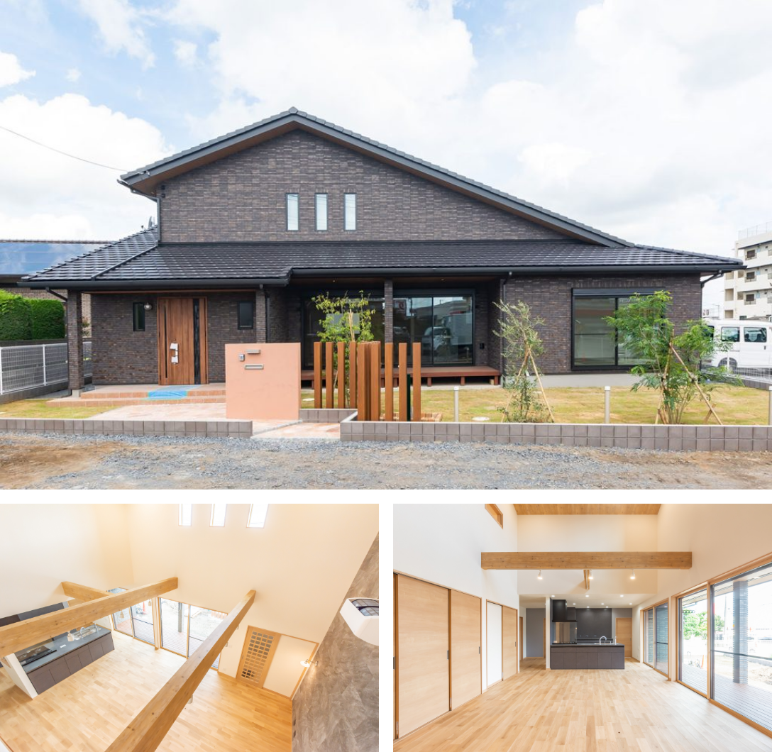 外観は重厚感のある総タイル貼り仕様。タイル1枚1枚を丁寧に貼り付けて仕上げています。床材は無垢材を採用し、冬でも裸足が気持ち良く、木の質感を感じられる自然の優しさに包まれる平屋です。